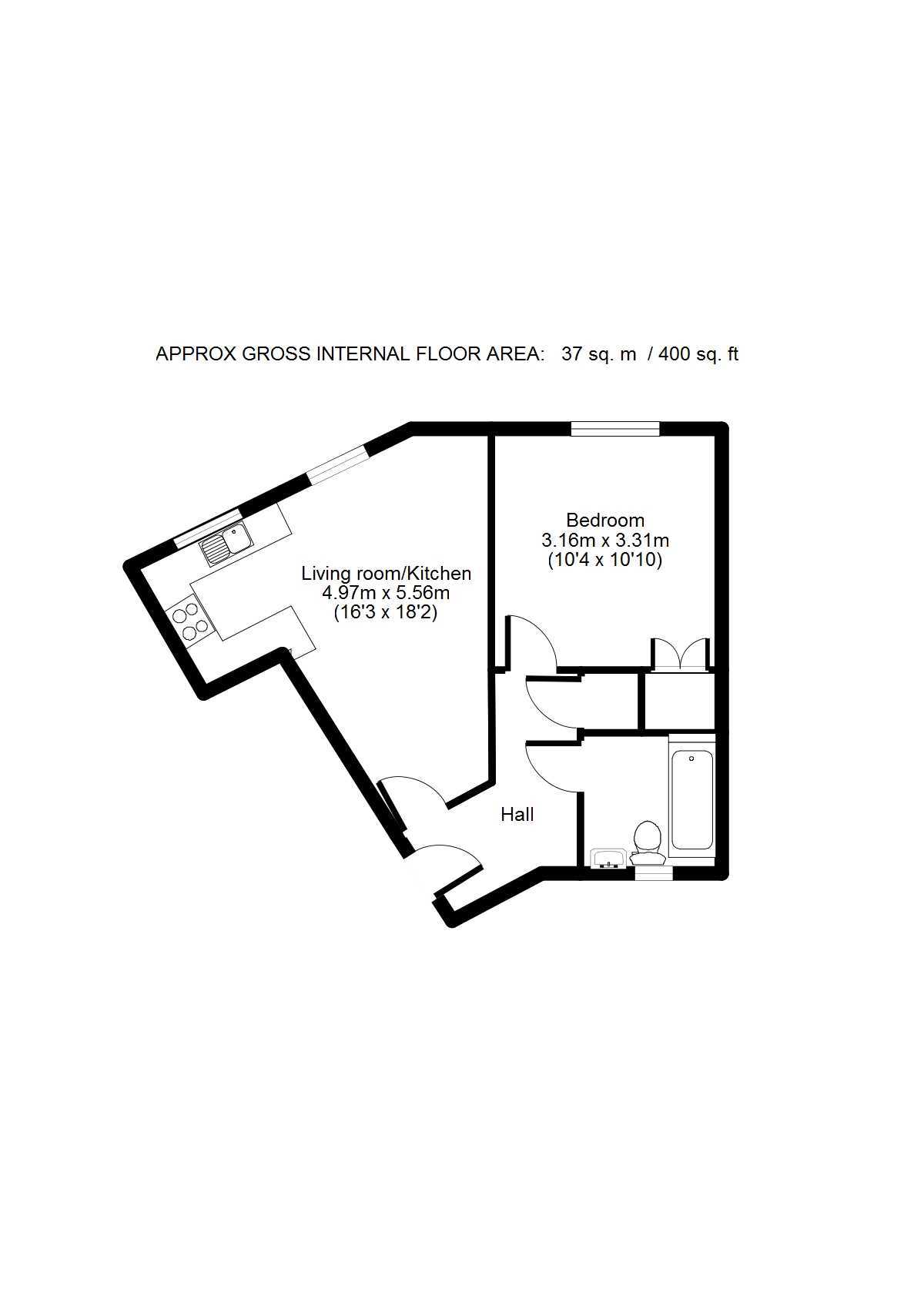 Living/kitchen area – 5.9m x 4.7m max (19’4’’ x 15’5’’ max)