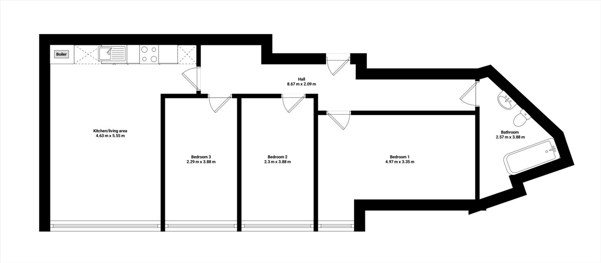 The apartment comprises of an entrance hall, two double bedrooms both with windows providing pleasant views, a further single bedroom/study room with central pillar, a well-equipped modern kitchen with adjoining living and dining area, and a fully-tiled bathroom complete suite with bath and shower.